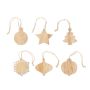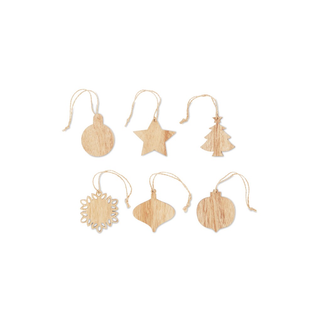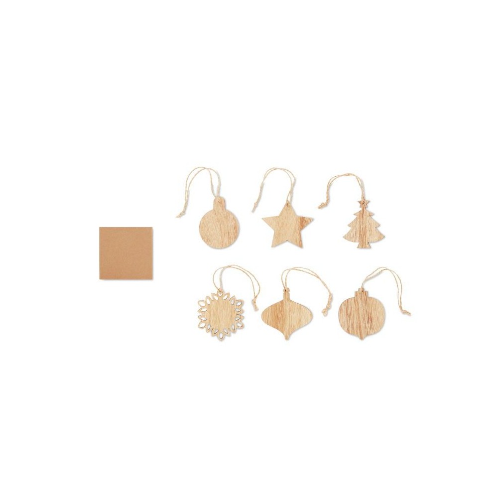 6 darabos, bükkfából készült, juta zsinóros karácsonyfadísz készlet. Fenyőfa, hópehely, és különféle függődísz formákkal. Kraftpapír dobozban szállítjuk. Emblémázás: Gravírozás, Tamponnyomás
