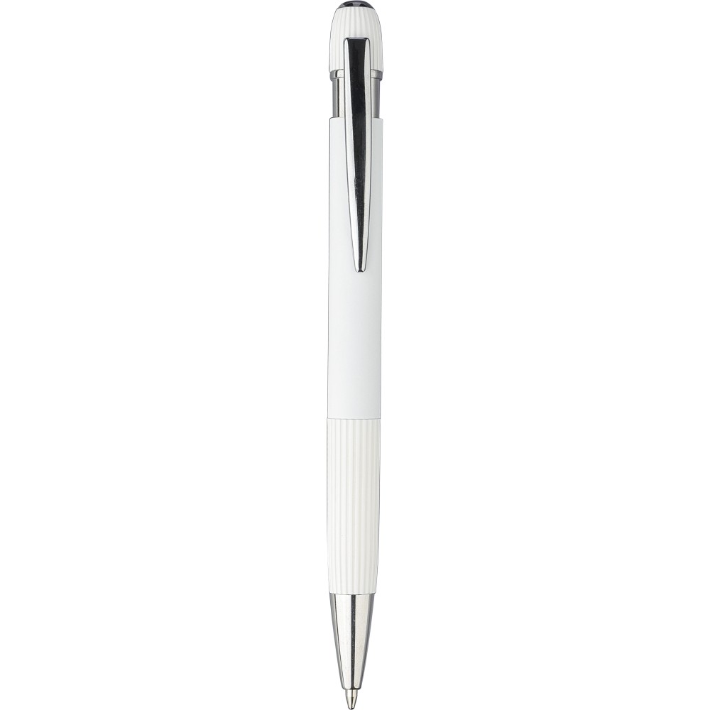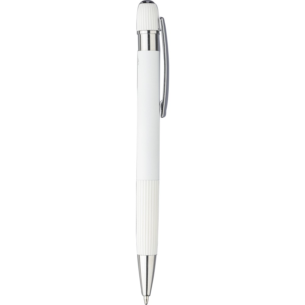 Újrahasznosított alumínium golyóstoll gumírozott felülettel. Csíkos részletekkel a markolaton és a tetején, krómozott műanyag heggyel és fém klipsszel ellátott nyomógombbal. Lézergravírozott újrahasznosított logóval. Kék tintával.