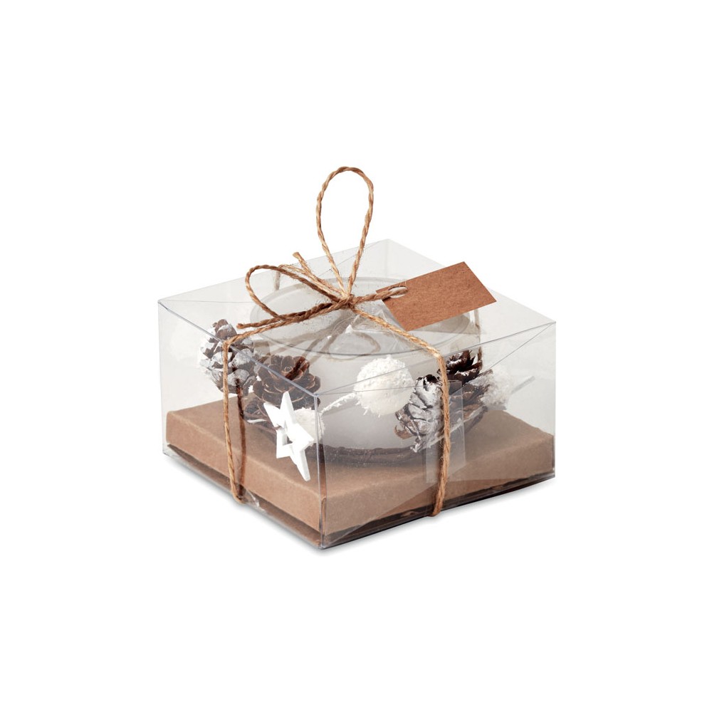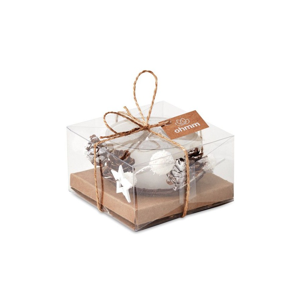 Díszekkel körbevett üveg mécsestartó. Karton és PVC ajándékdobozban, zsinórral átkötve, kis ajándékkísérő kártyával szállítjuk. Emblémázás: Matricázás