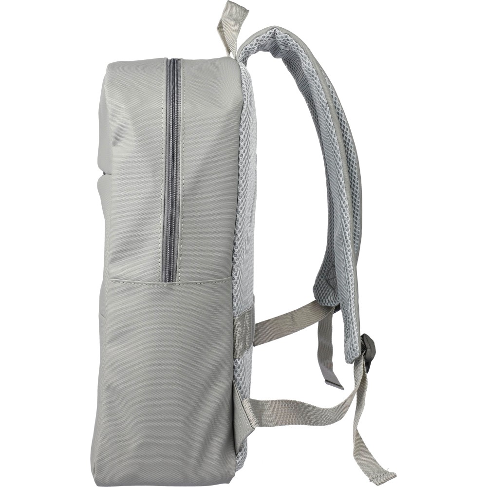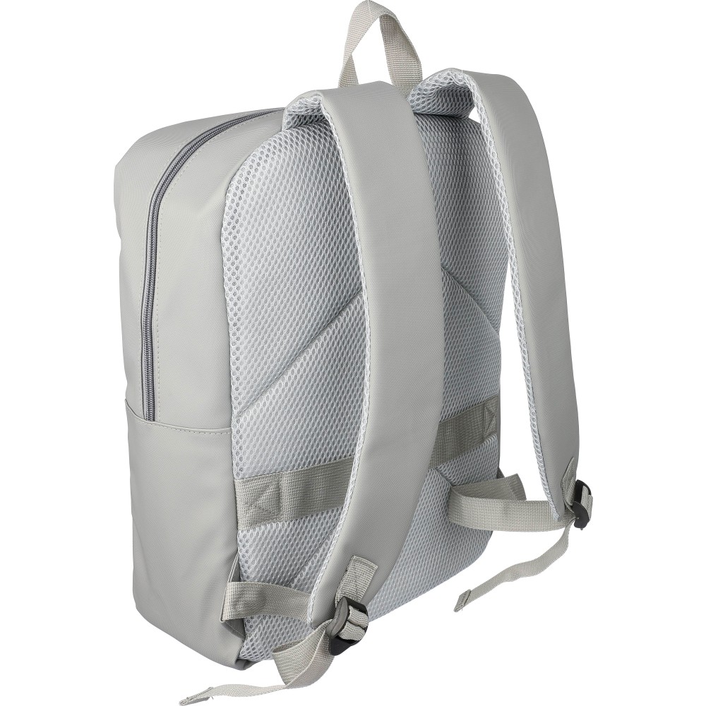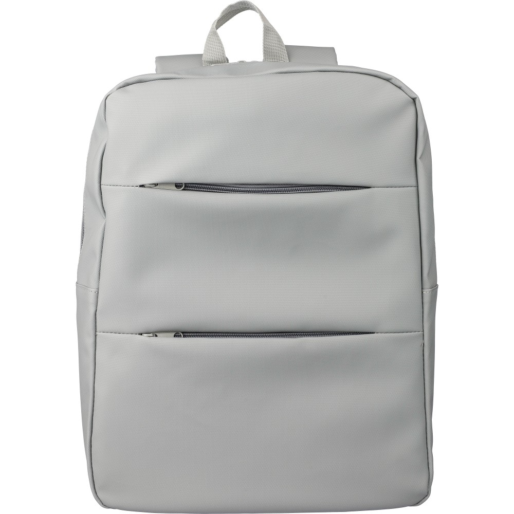 Laptop hátizsák 15 -es készülékhez. Két cipzáras elülső zsebbel, egy nagy cipzáras rekesszel és tépőzáras laptoprésszel, valamint több belső zsebbel. Szellőző, párnázott hátoldallal, trolifogantyúval és állítható vállpántokkal. Vízlepergető. Anyaga: PU. Emblémázás: Szitanyomás