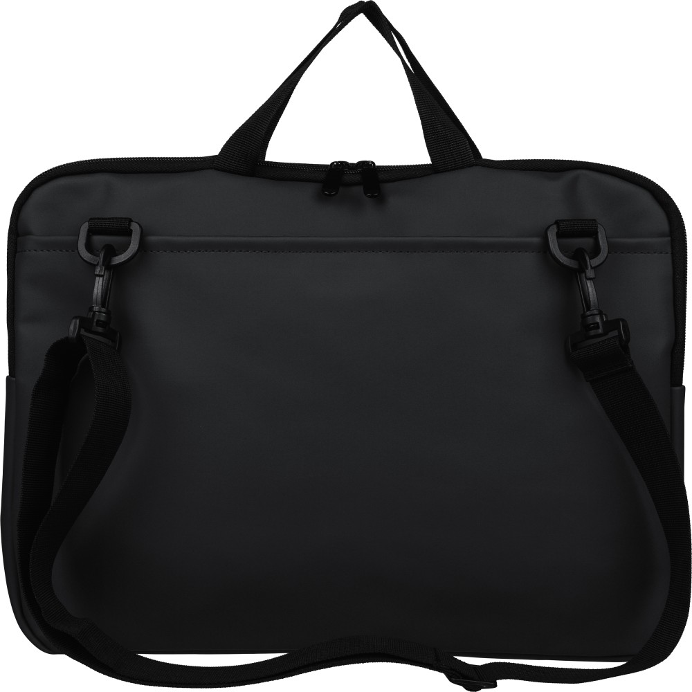 Újrahasznosított PU anyagból készült laptoptáska legfeljebb 15 hüvelykes készülékekhez, 4 mm vastag párnázással és 210D újrahasznosított béléssel. Elülső cipzáras zsebbel, hátoldali tépőzáras zsebbel, két rövid fogantyúval és állítható vállpánttal rendelkezik. A belső címkén újrahasznosított alapanyagra utaló logó található.