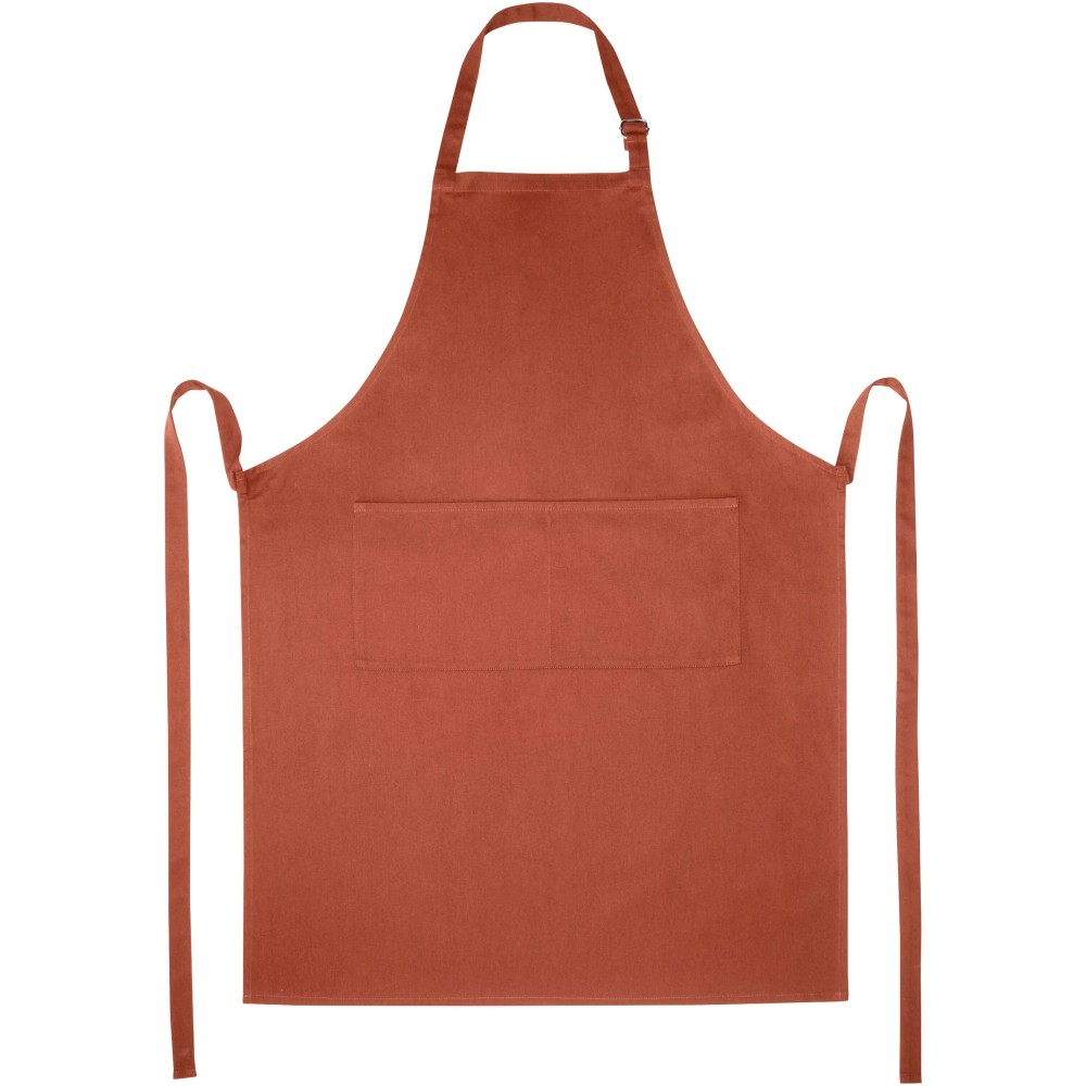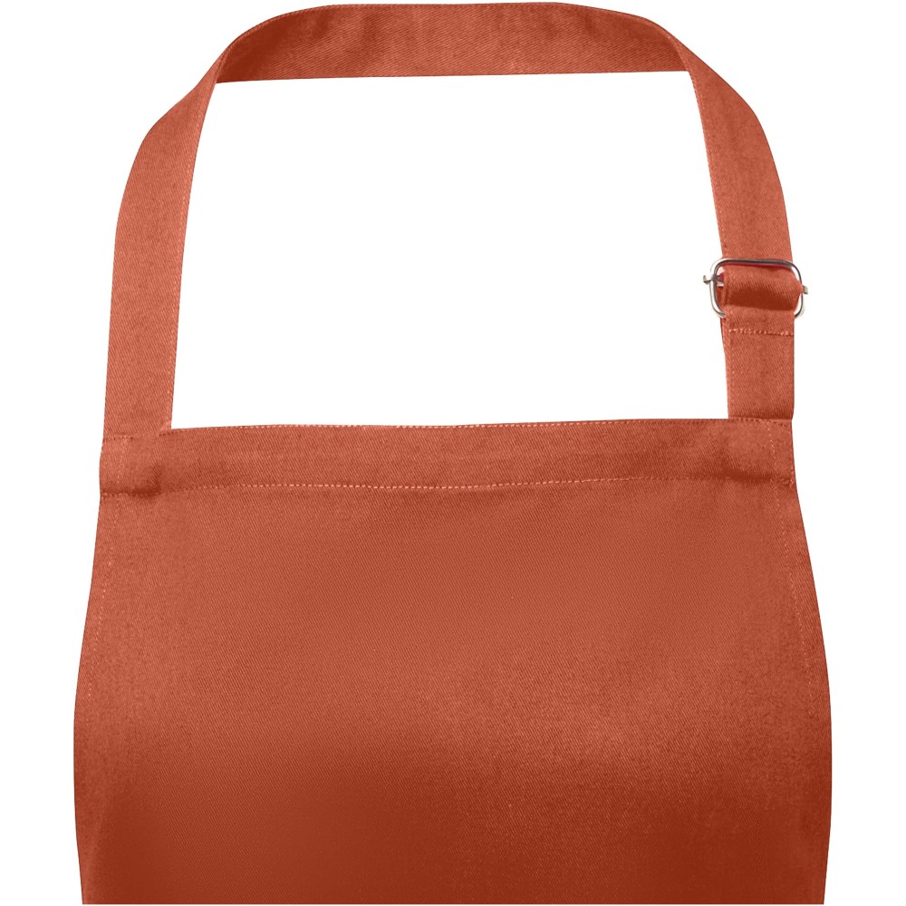 Vastag és masszív anyag, ugyanakkor puha és kényelmes viselet. A két elülső zseb gyors és egyszerű módot kínál a konyhai eszközök tárolására. A kötény nyakában csattal állítható, hátul megköthető. Nagyméretű nyomtatási lehetőség a logók megjelenítéséhez. Pamut twill 65% poliészterből és 35% pamutból, 240 g/m2. Emblémázás: Hímzés, Szitanyomás