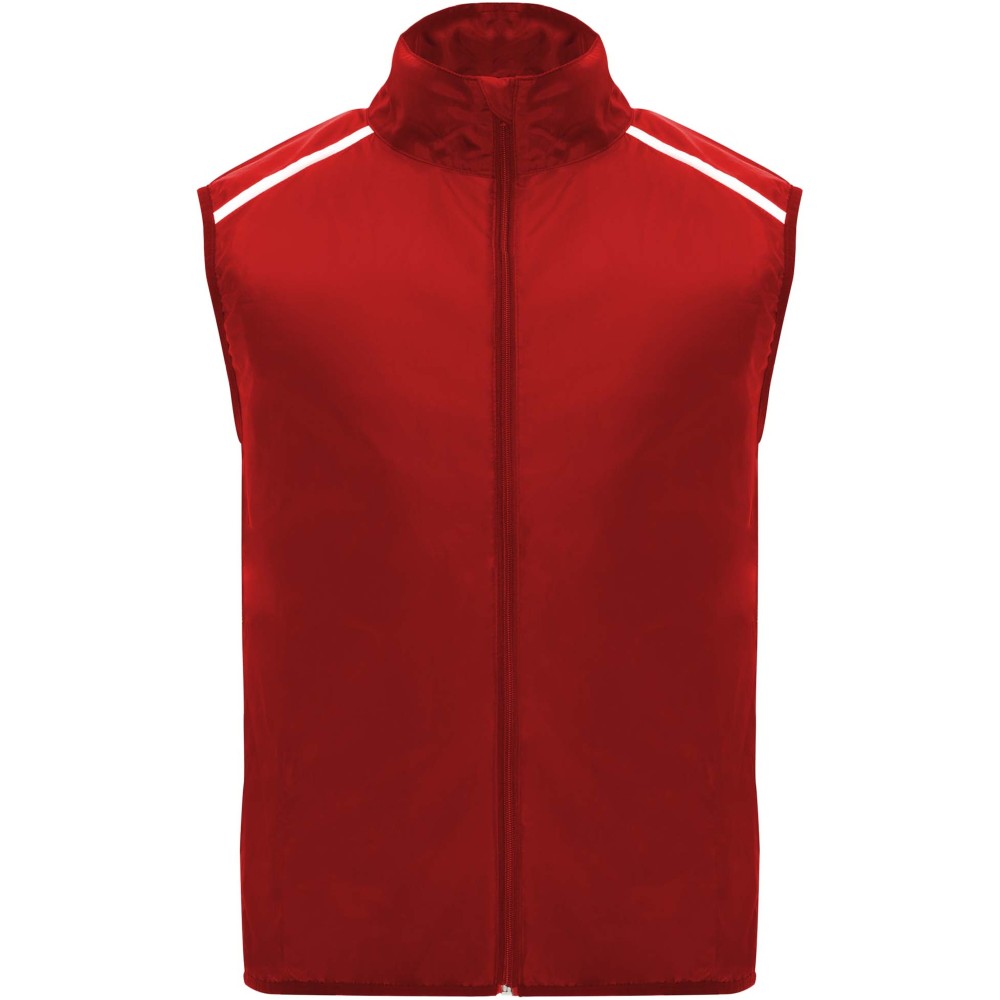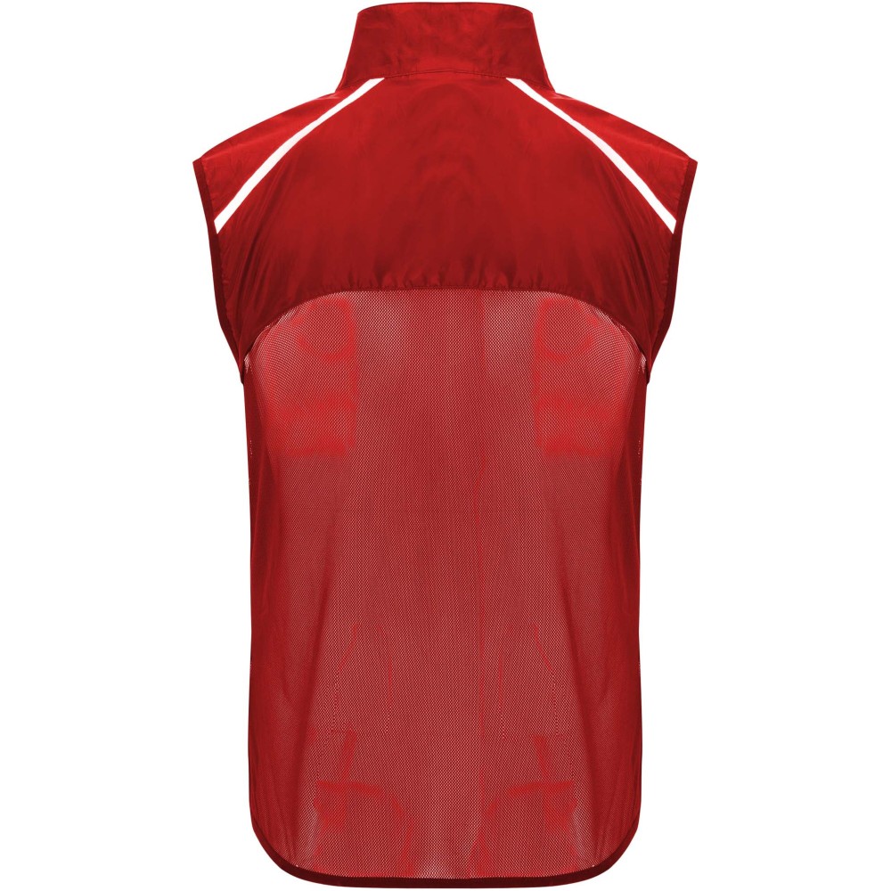 Szélálló és légáteresztő. Elülső cipzár azonos színű állvédővel. Rugalmas szegély a karkivágásnál és az alján. A hát alsó része mikroperforált anyagból készült. Fényvisszaverő csíkok a vállán. Zseb rugalmas pánttal, amelybe a mellényt el lehet csomagolni. Eltávolítható címke. Emblémázás: Szitanyomás