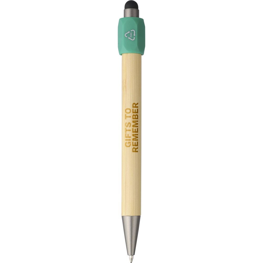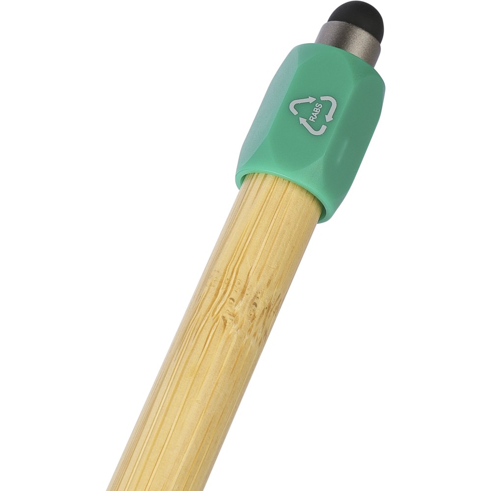 Bambusz golyóstoll újrahasznosított ABS pörgettyűvel és fekete érintővel a nyombógombon. A tollhegy vastagsága 1.0 mm, íráshossz: kb. 800 méter. Az újrahasznosított anyagra utaló logó a tollra van gravírozva. Emblémázás: Gravírozás, Tamponnyomás