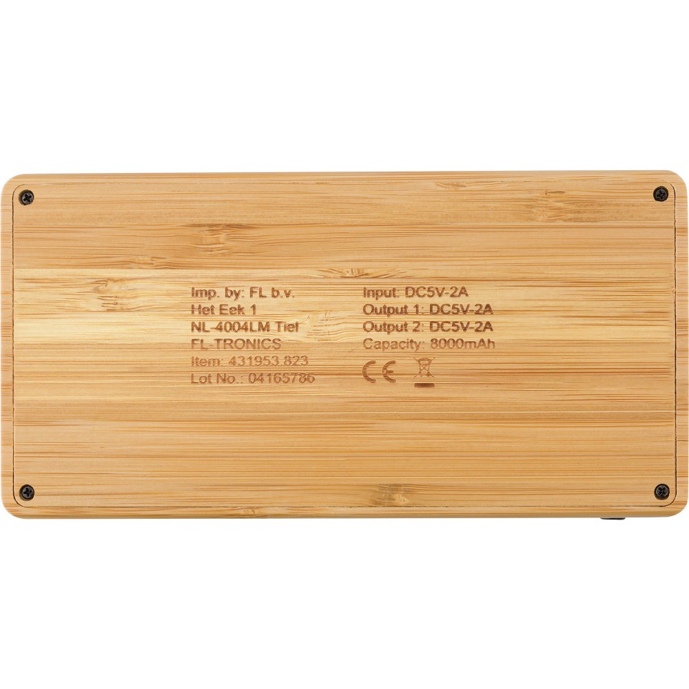 Bambusz napelemes powerbank 8.000 mAh kapacitással. Két USB és egy micro USB csatlakozóval, négy LED jelzőfénnyel. Bemenet: DC 5V/2A, kimenet: DC 5V/2A. A vezetéket tartalmazza. Veszélyes áru, csomagban nem küldhető. Emblémázás: Gravírozás, Tamponnyomás