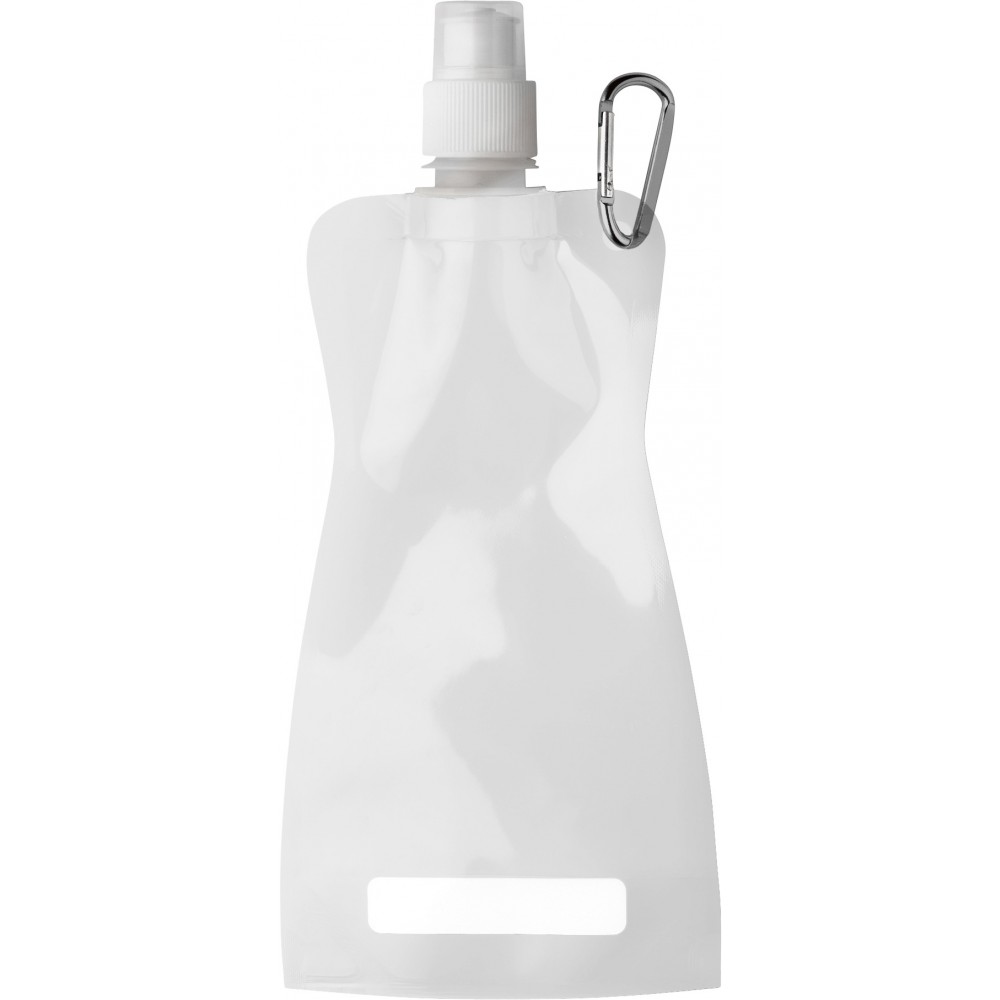 Összehajtható vizeskulacs karabinerrel. Nem szivárgásmentes. Mosogatógépben nem tisztítható. 420ml. BPA-mentes műanyag. Emblémázás: Tamponnyomás