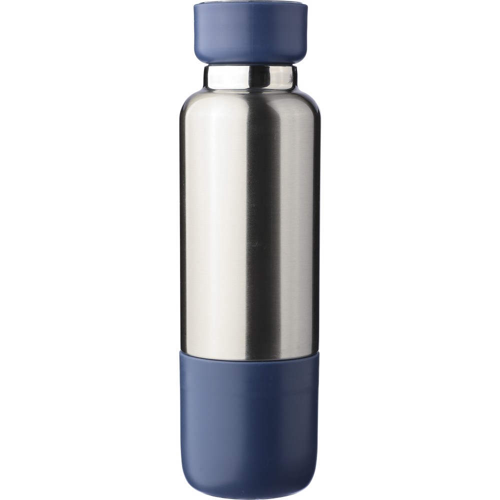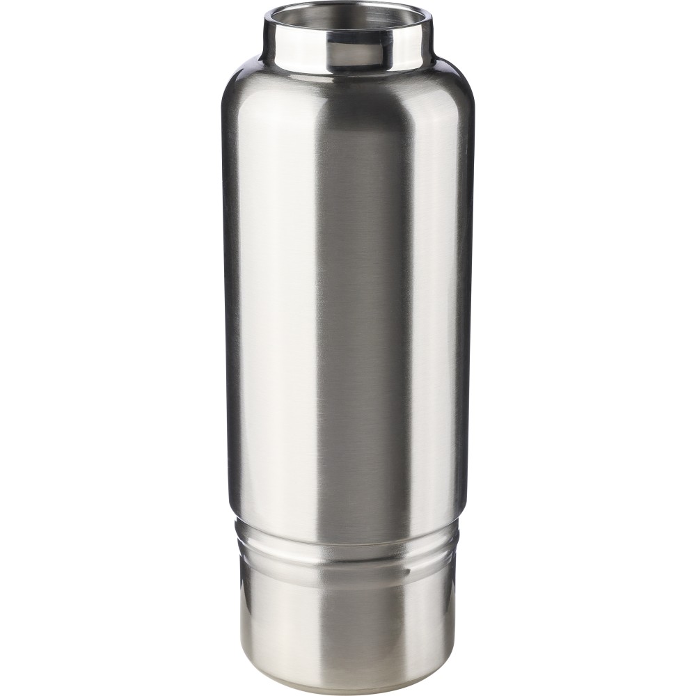 Duplafalú rozsdamentes acél kulacs, 500 ml-es. 304-es rozsdamentes acél belsővel és 201-es rozsdamentes acél külsővel. Átlátszó rekesszel ellátott PP csavaros kupakkal, cserélhető poliészter csuklópánttal, valamint egy 200 ml-es PP pohárral az alján. Ezüst színű felület matt részletekkel. Csomagolása barna papírdoboz. Emblémázás: Gravírozás